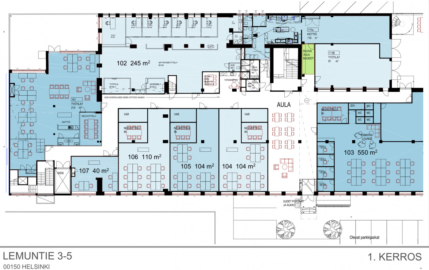 Vuokrataan ensimmäisen kerroksen 104m2 toimistotila erinomaisella sijainnilla Vallilassa. Vallilan Akseli & Elina on tunnettu etenkin designin, teollisen muotoilun sekä muiden luovien alojen yrityksistä. Kiinteistön tiloissa yhdistyvät kiehtovalla tavalla mennyt, nykyisyys ja tuleva.