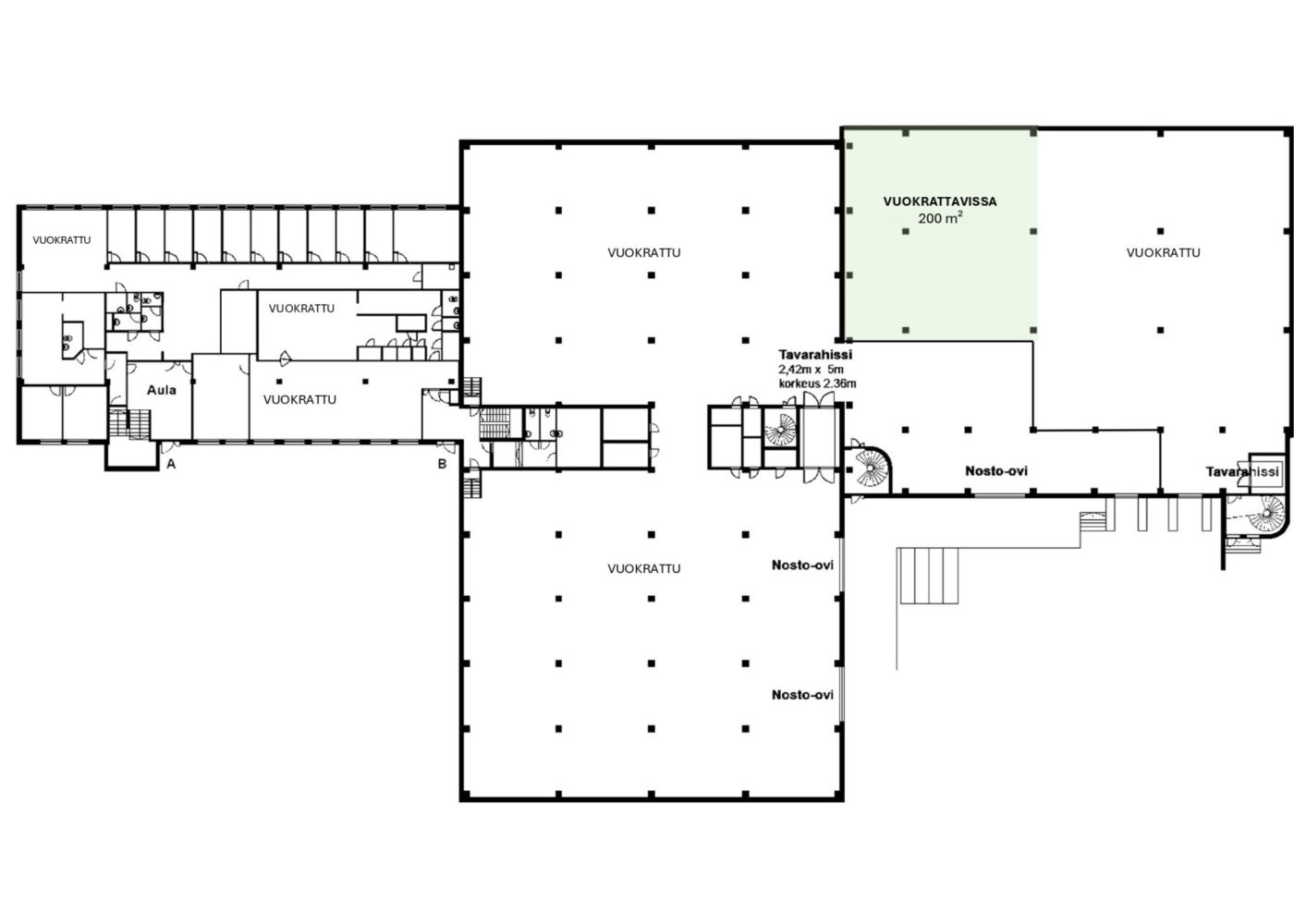Kokonaisuus vuokrataan yhdessä 182 m2 toimistotilan kanssa, joka sijaitsee kiinteistön toisessa kerroksessa. Ratkaisu mahdollistaa varasto- ja toimistotoimintojen yhdistämisen saman katon alle, mikä tehostaa arjen logistiikkaa ja henkilöstön työskentelyä.