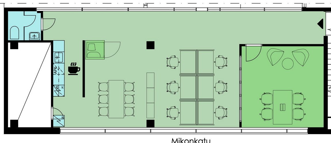 | Huoneiden kuvaus: Avotila + neuvotteluhuone + keittiö ja sos.tilat |
