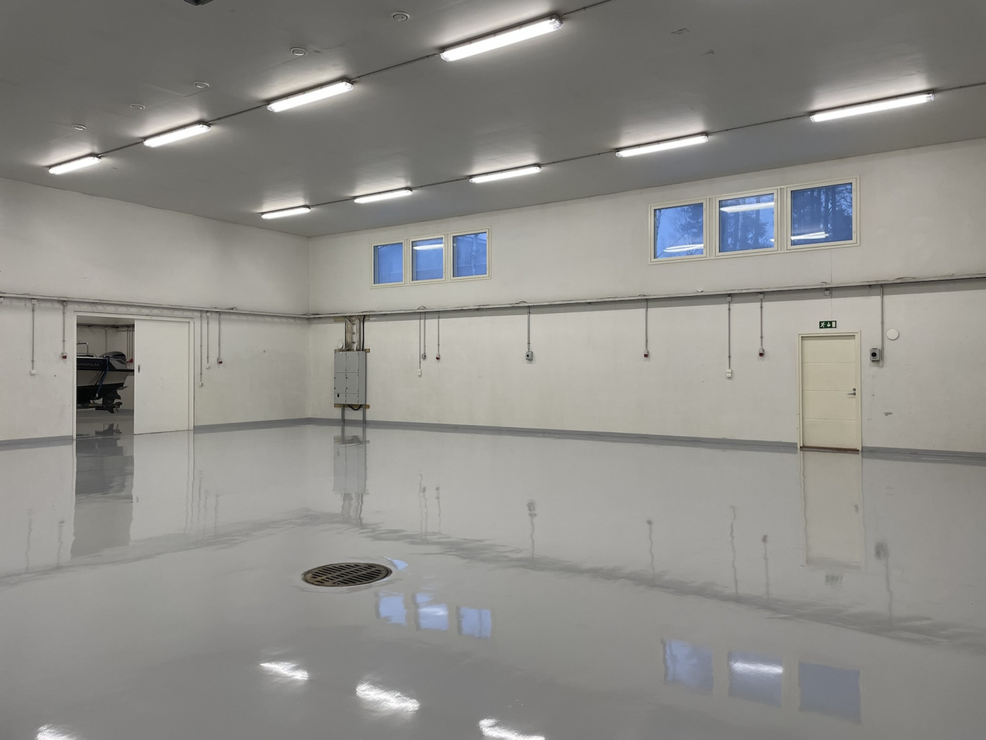 Hallitila on jaettu kahteen lohkoon n. 260m2 ja n.152m2. kevyellä väliseinällä, jossa on ovellinen kulkuaukko. Hallin syvyys 15,50 metriä ja vapaa korkeus 5,20 metriä.