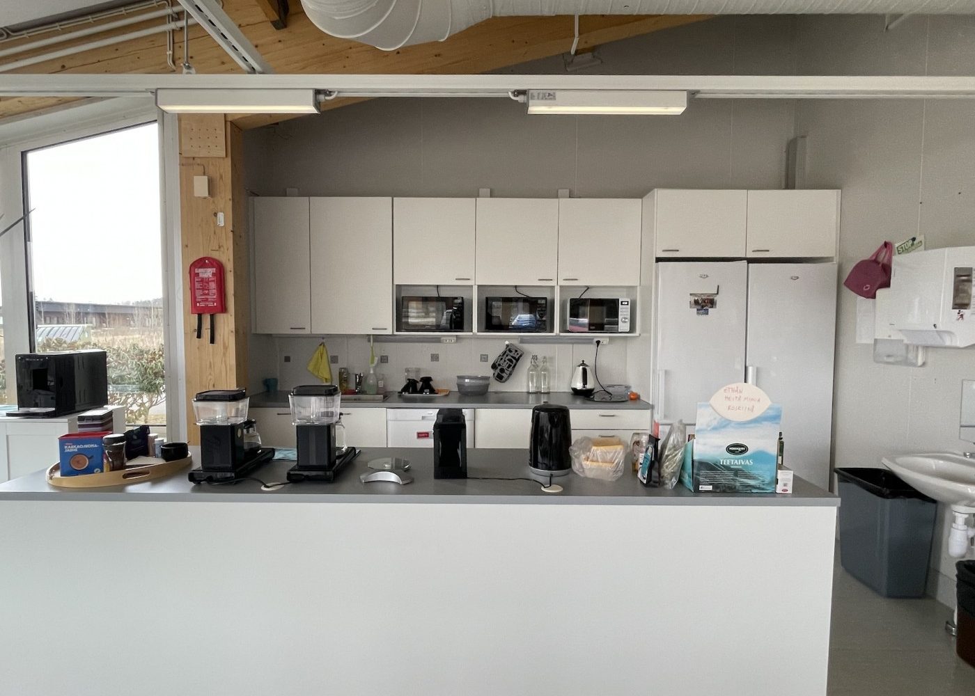 Kokonaisuus koostuu keskenään hyvinkin erikokoisista työhuoneista, avarasta ja isosta tauko-/ruokailutilasta, jossa on iso avokeittiö saarekkeineen, sekä useista wc-tiloista.