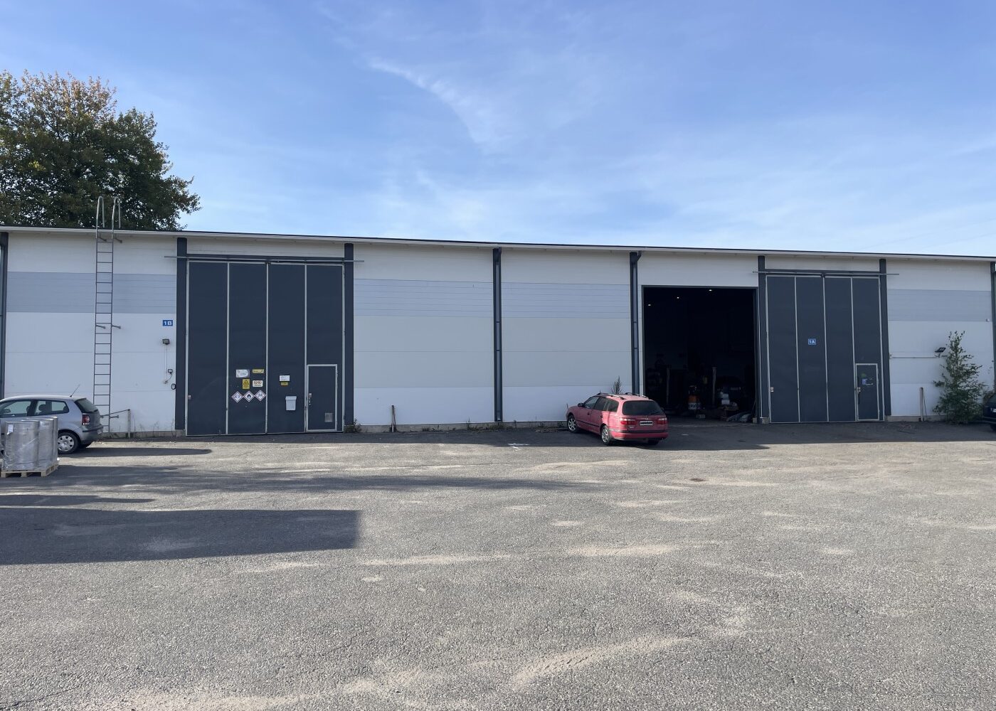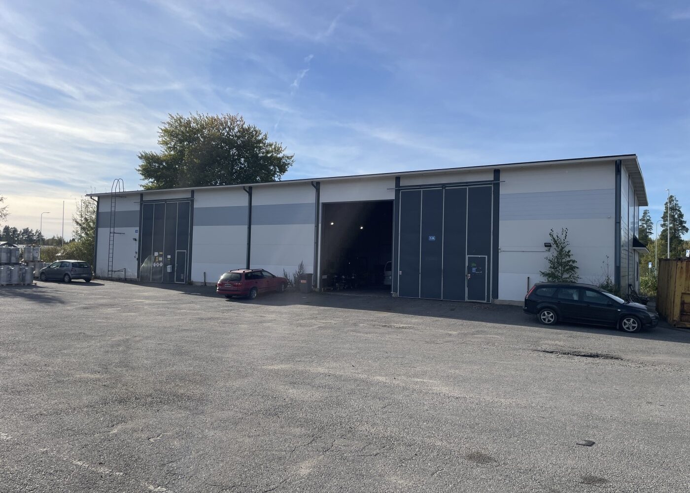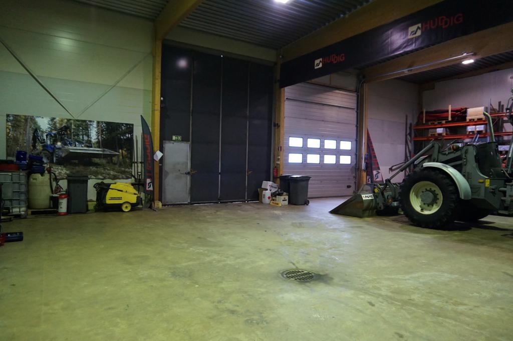 Hallin sisämittapituus 16,8 m ja leveys 20,0 m. Hallin vapaa korkeus 5,5metriä. Tiloihin johtaa kahdet isot ovet, kahden asiakaskäynti-oven lisäksi. Taitto-oven mitat 5,4 x 5,4m sekä nosto-oven mitat 4,5 x 4,5m. Hallissa lattiakaivo. Öljylämmitys, vuosikulutus ollut 3 000 litran luokkaa.