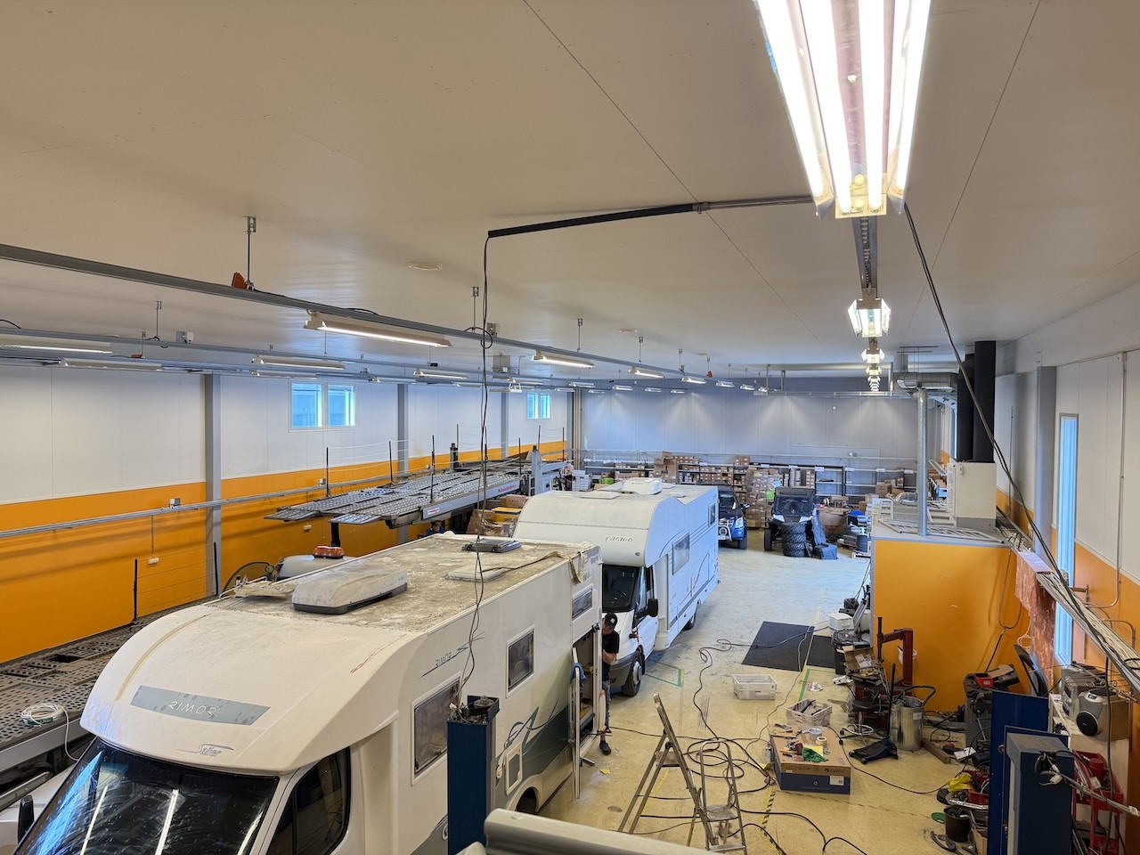 Tilakokonaisuus, jossa 425m2 hallitilan lisäksi 190m2 toimistotilat kahdessa kerroksessa. 1.kerroksessa iso taukotila, jossa avokeittiö. Lisäksi samassa kerroksessa on väestönsuoja ja kahdet vessat, joista toinen inva-mitoitettu.