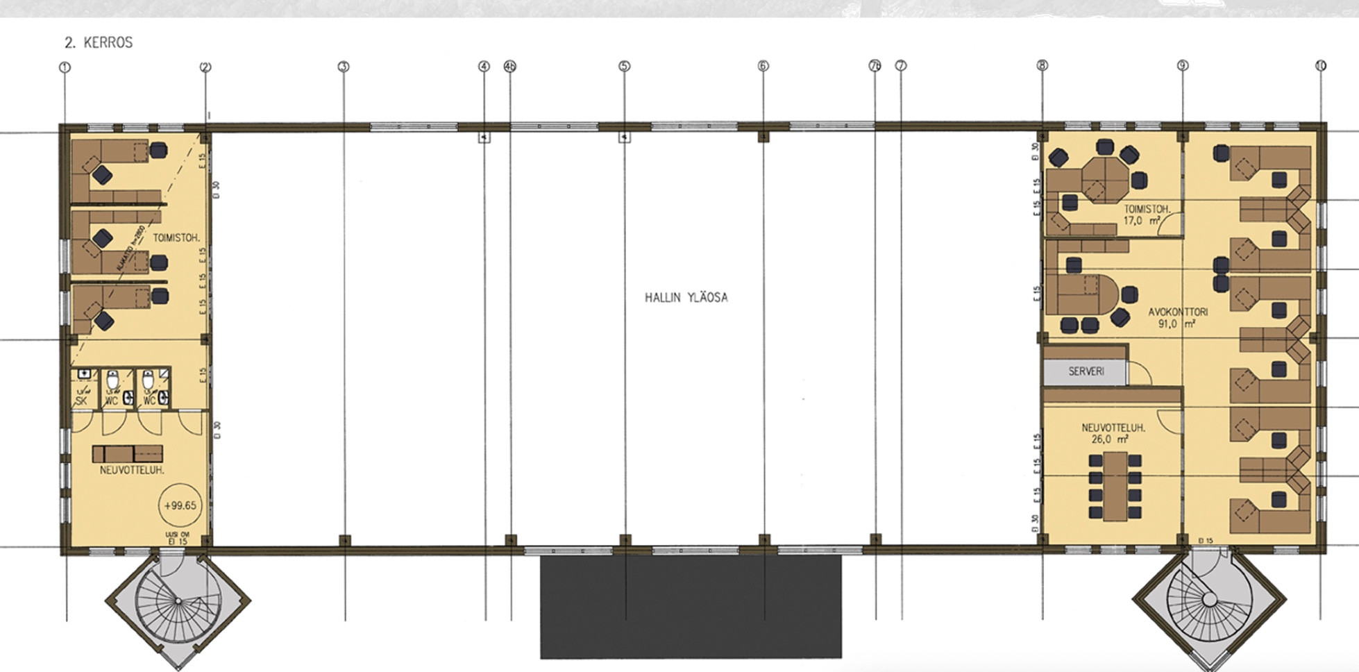 -Rakennuksen kummassakin päässä sisäänkäynti.
