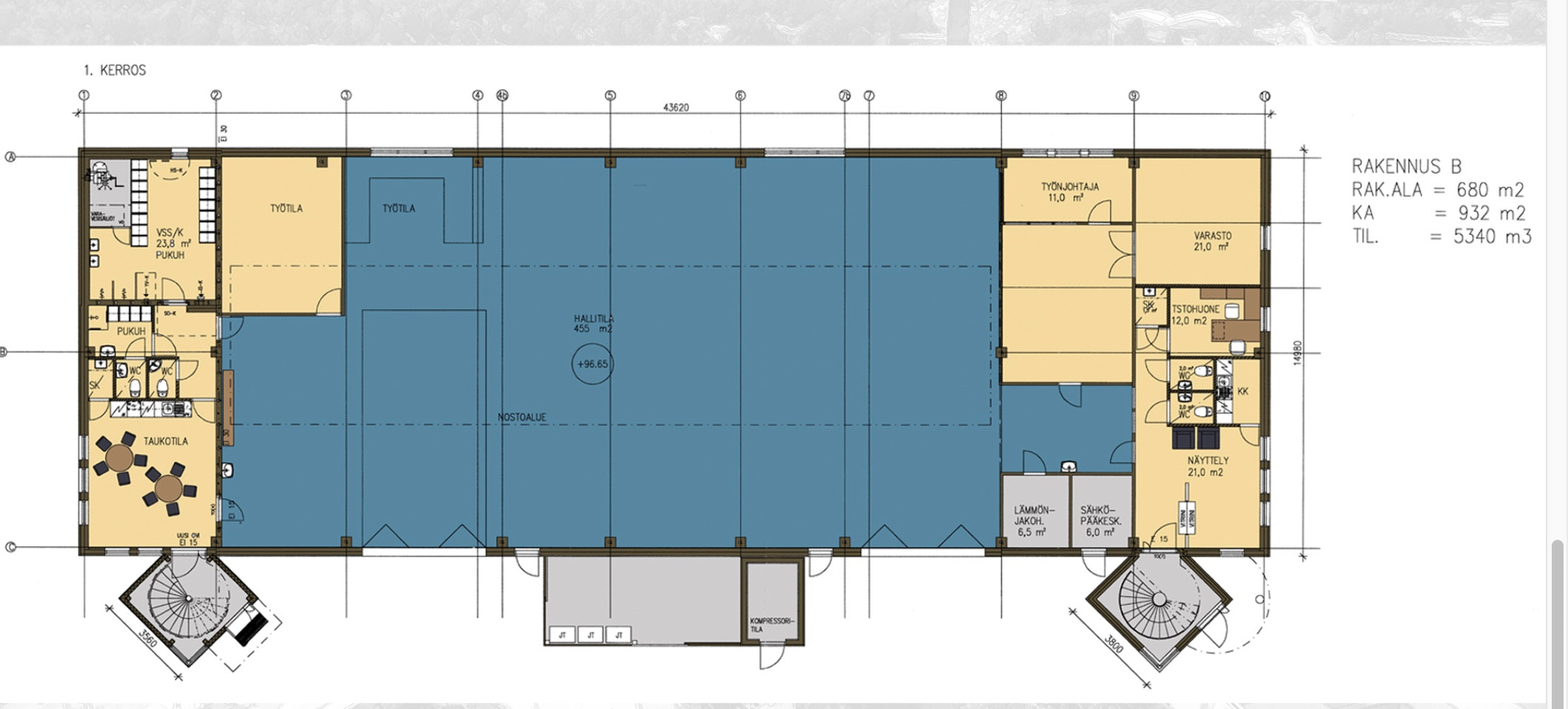 Hallinosturi, Viemäri, Suihku, Sosiaalitilat, Kestopäällystetty piha-alue (asfaltti/betoni), Keittiö, Voimavirta, WC, 10 tkg kattonostin.