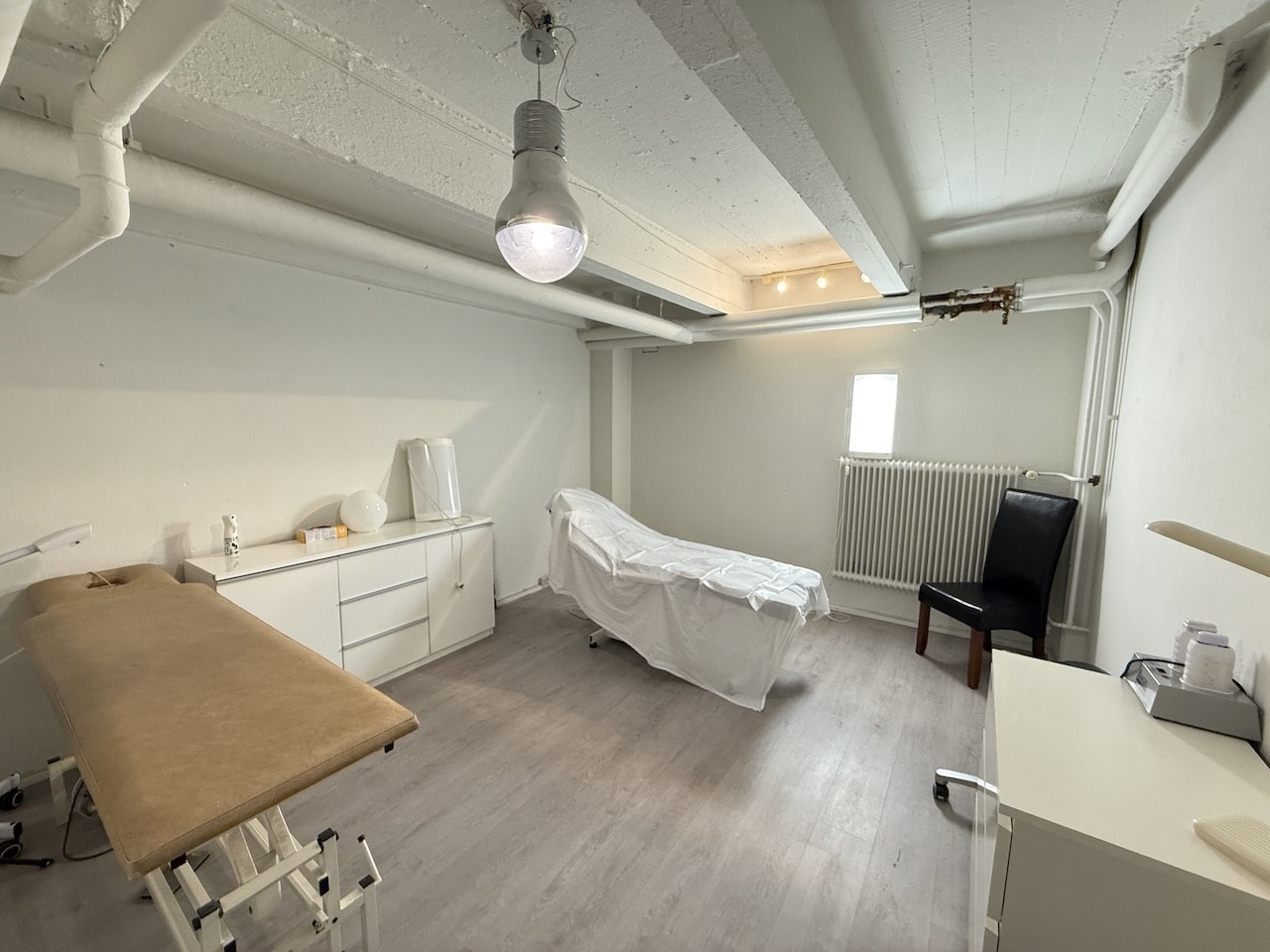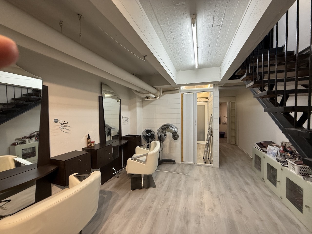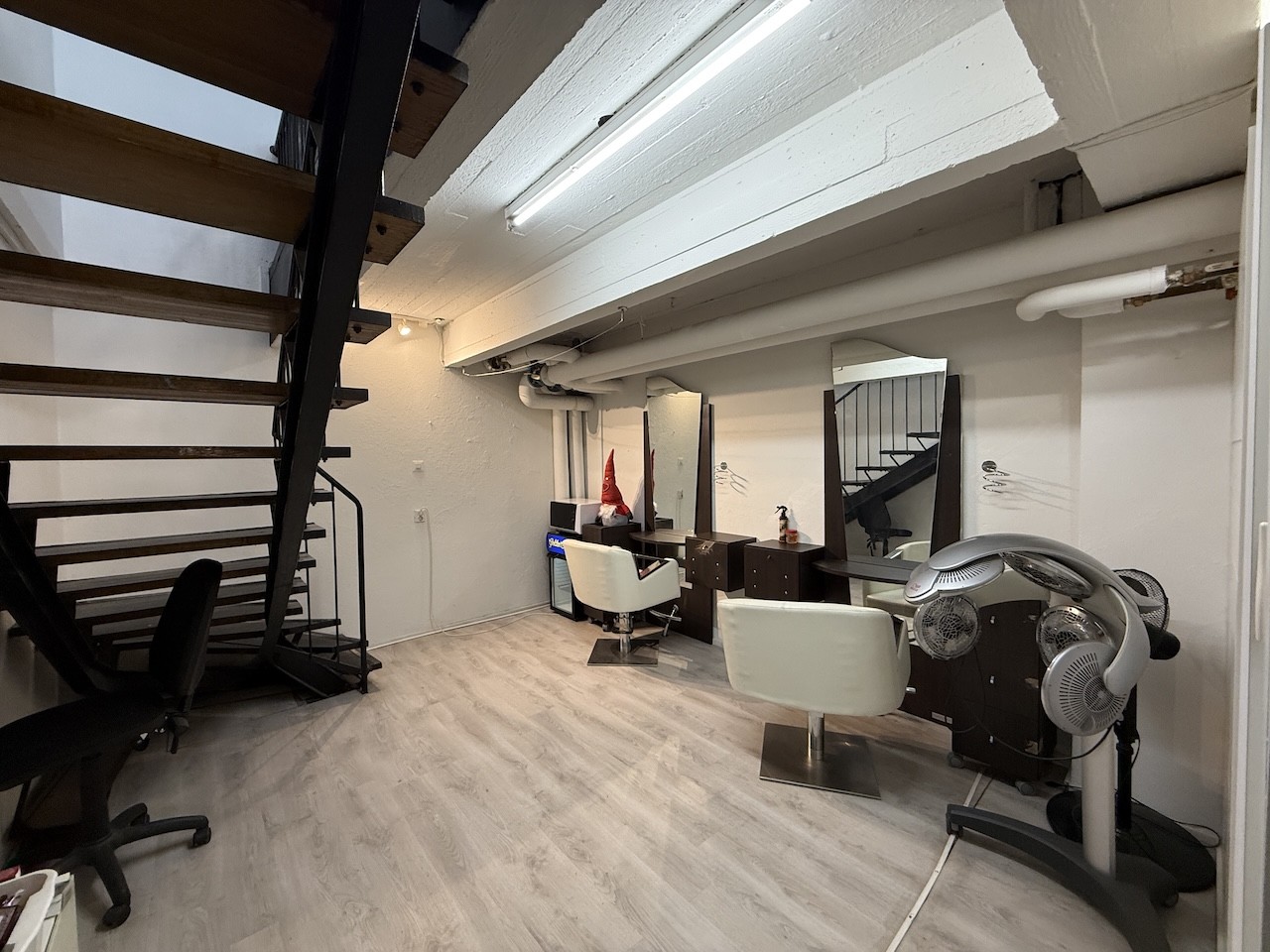 Liiketilan (46 m2) lisäksi alakerrasta löytyy 44 m2 varastotila. Alakertaan on rakennettu kevyitä huoneita. Wc-on yläkerran takaosassa.