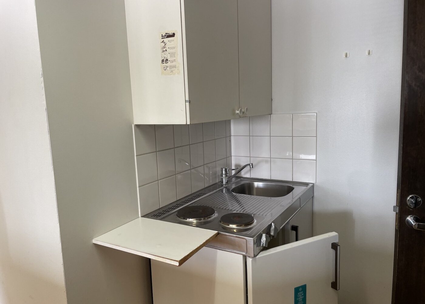 Tilakokonaisuus, jossa aulatilan lisäksi kaksi huonetta. Wc-tilat ja minikeittiö sijaitsevat aulatilassa.
