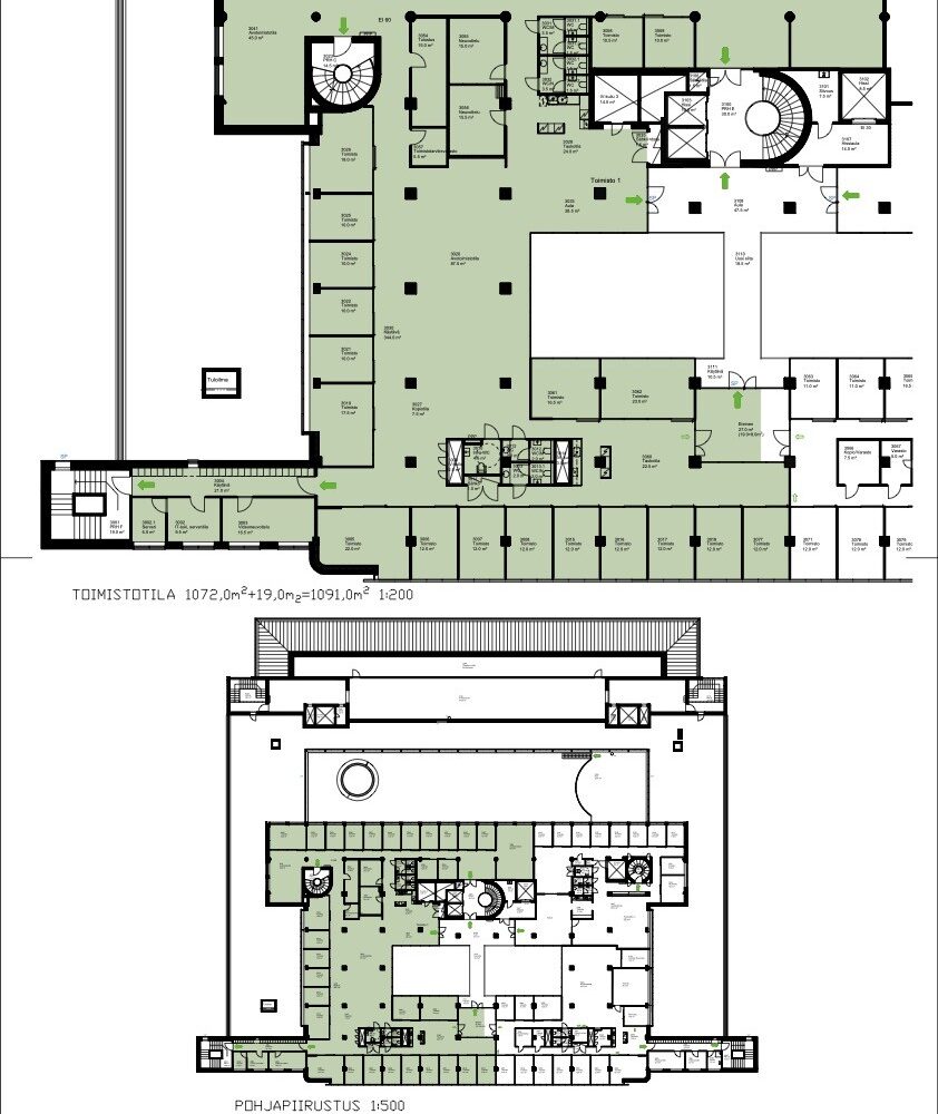 Tilakokonaisuus, jossa avotilan lisäksi erikokoisia työhuoneita 28 kpl, lisäksi keittiö-taukotila ja kahta neuvotteluhuone ym. Wc-tiloja yhteensä 5 kpl, joista yksi on esteetön.