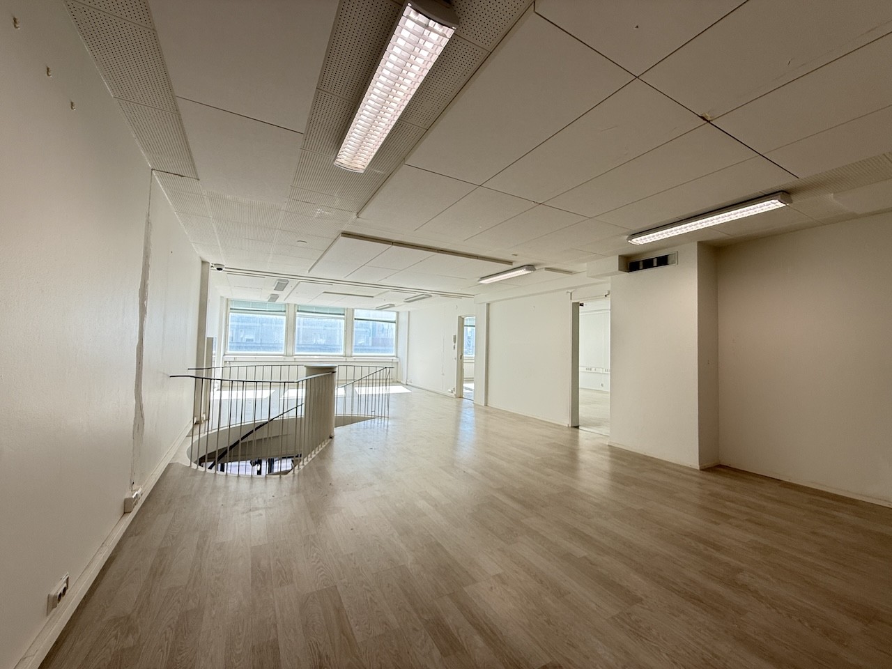 Toimistot: Toisessa kerroksessa kahteen osaan jaettu siisti avotoimisto.