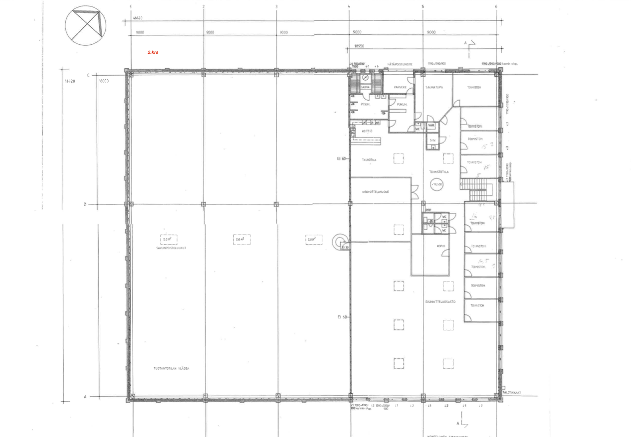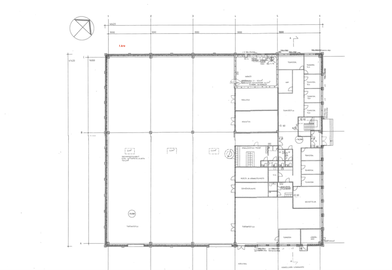 Tilakokonaisuus, jossa katutason kerroksessa on 1 118m2, noin 6 metriä korkeaa hallitilaa, jossa 5 tonnin siltanosturi. Siltanosturin nostokorkeuskapasiteetti vajaa 5 metriä.