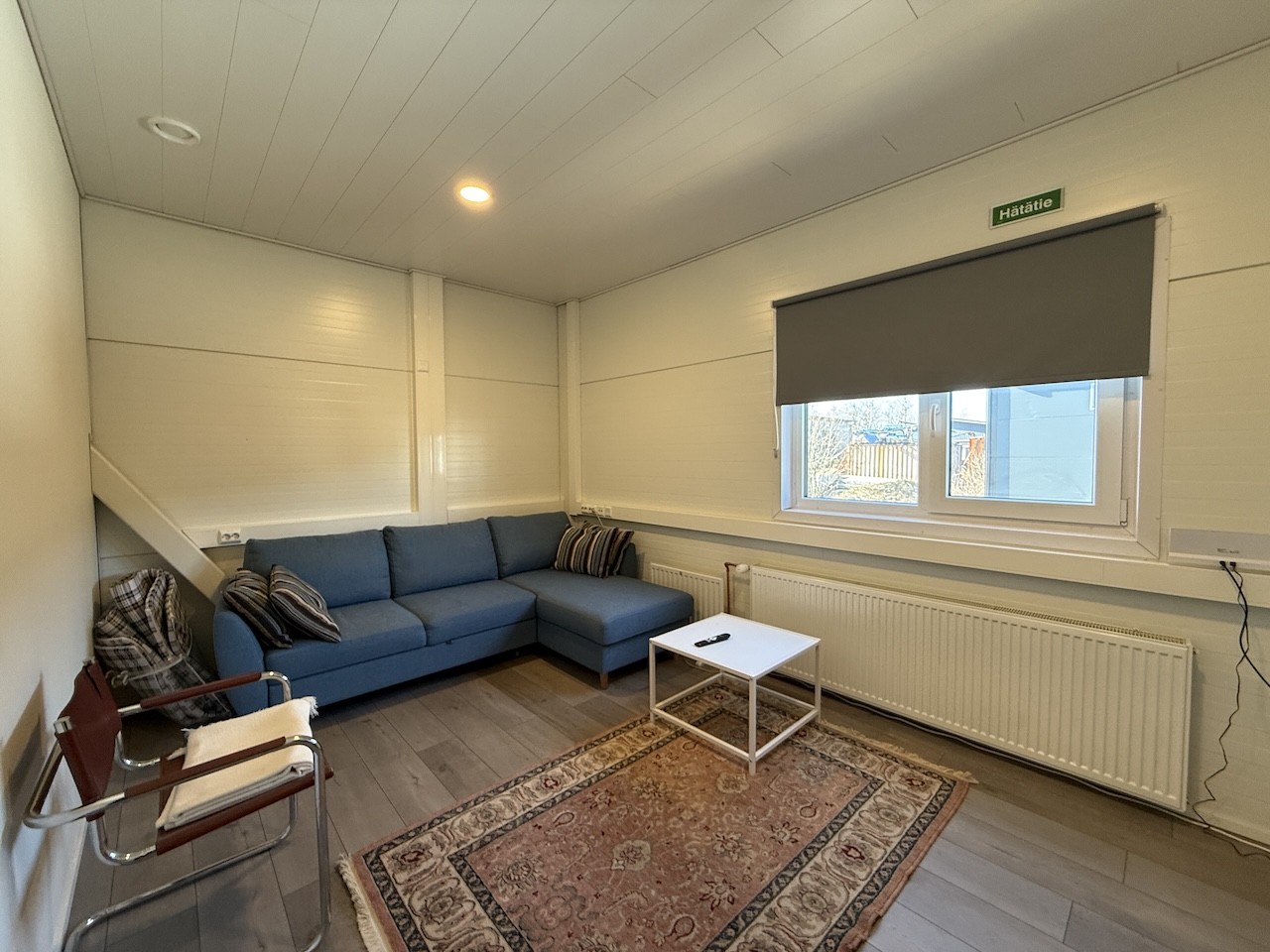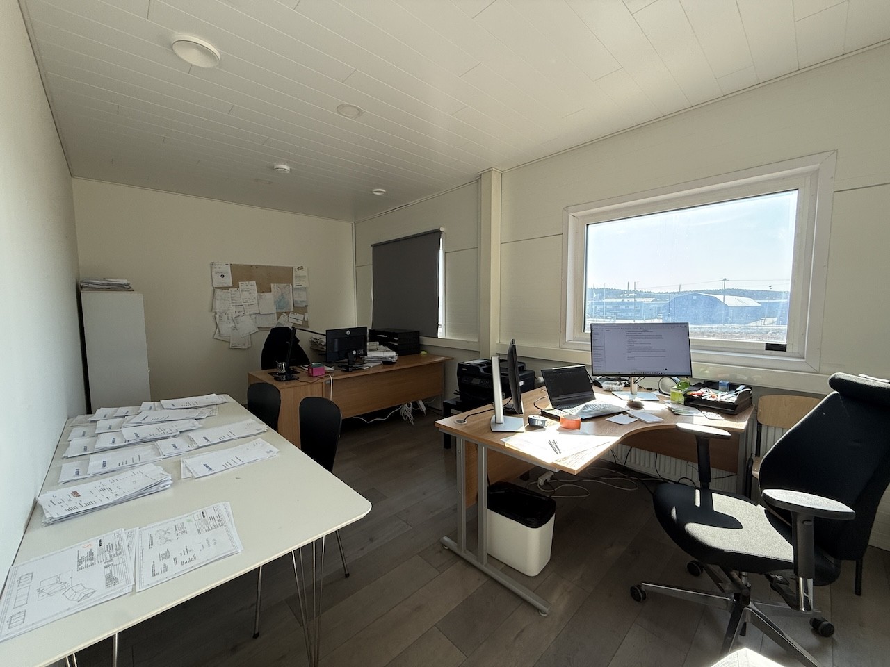 Hallin päädyssä kahdessa kerroksessa toimisto- ja sosiaalitiloja. Sosiaalitilat käsittävät pukeutumistilat, ison tauko/neuvottelutilan, kaksi wc:tä ja suihkun. Yläkerrassa toimistohuoneita ja neuvottelutilaksi sopiva isompi huone.