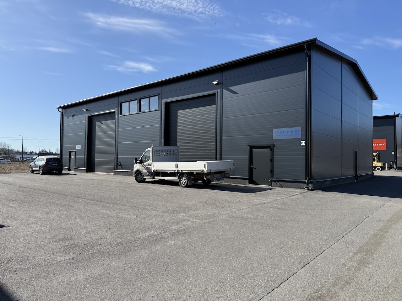Muutama vuosi sitten valmistunut laadukkaasti rakennettu hallirakennus Metsämäessä Orikedon tuntumassa. Turun Kehätien liittymä on muutaman sadan metrin päässä.