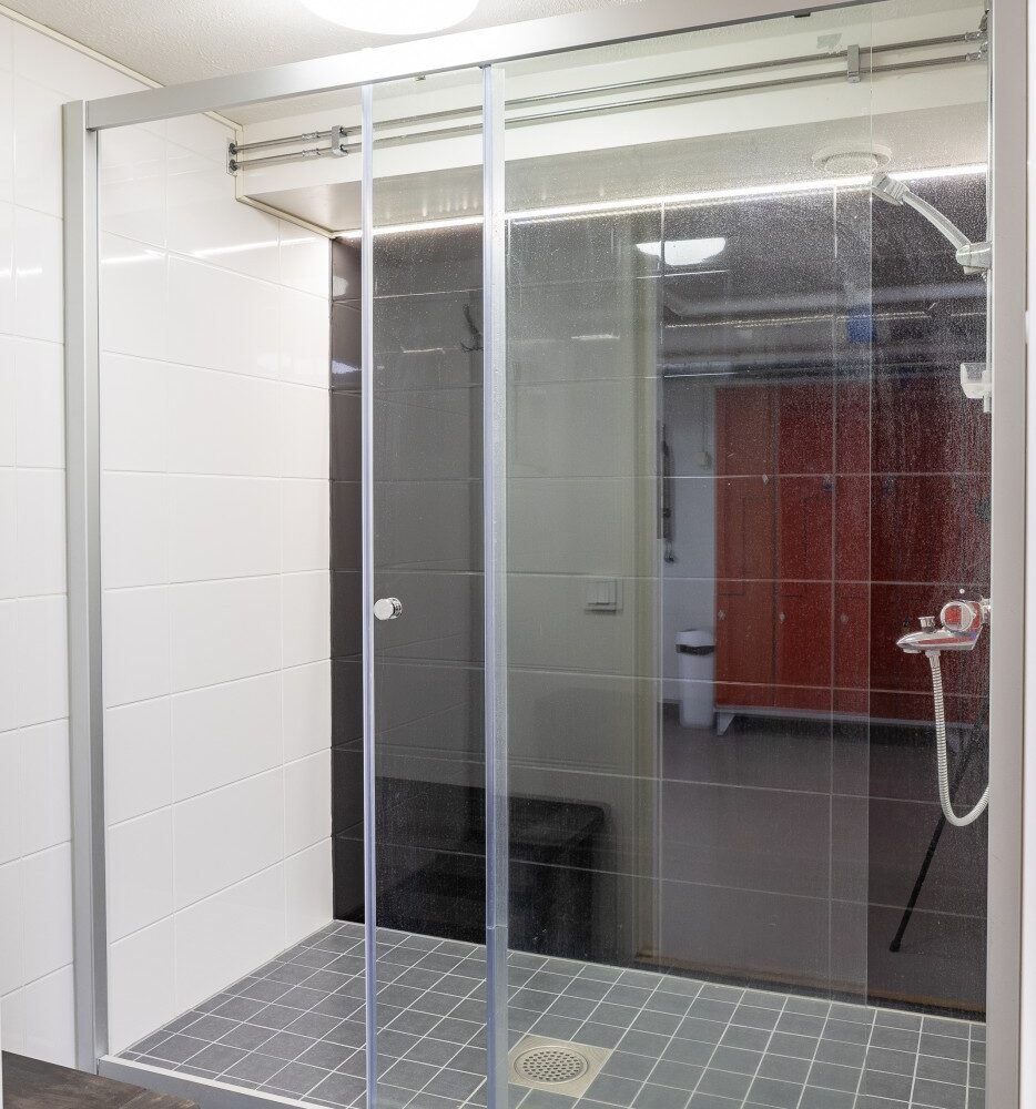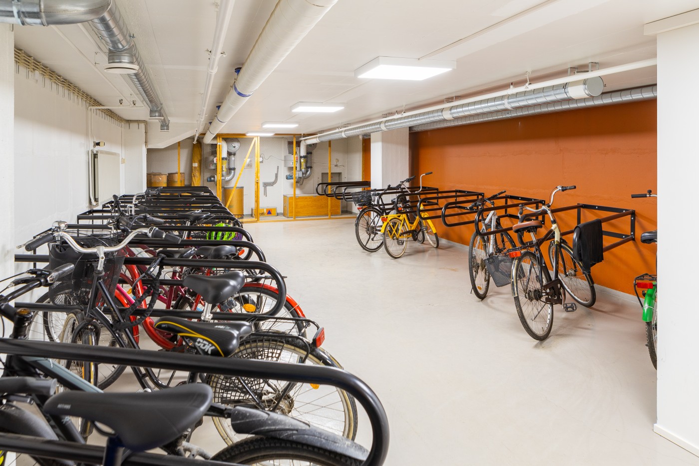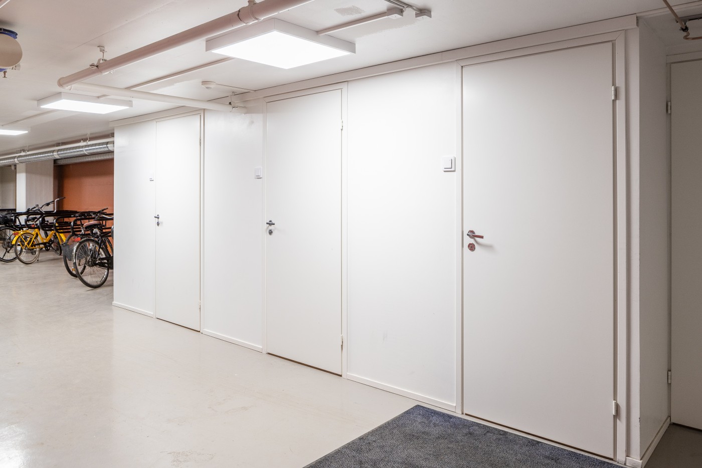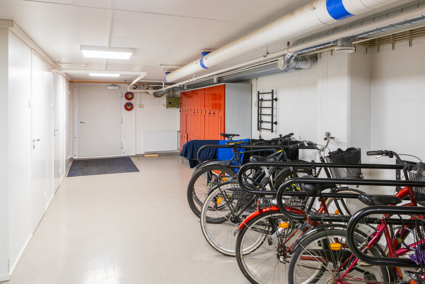 Kiinteistön kellarissa polkupyöräsuoja, jossa vaatekaapit ja suihkutilat