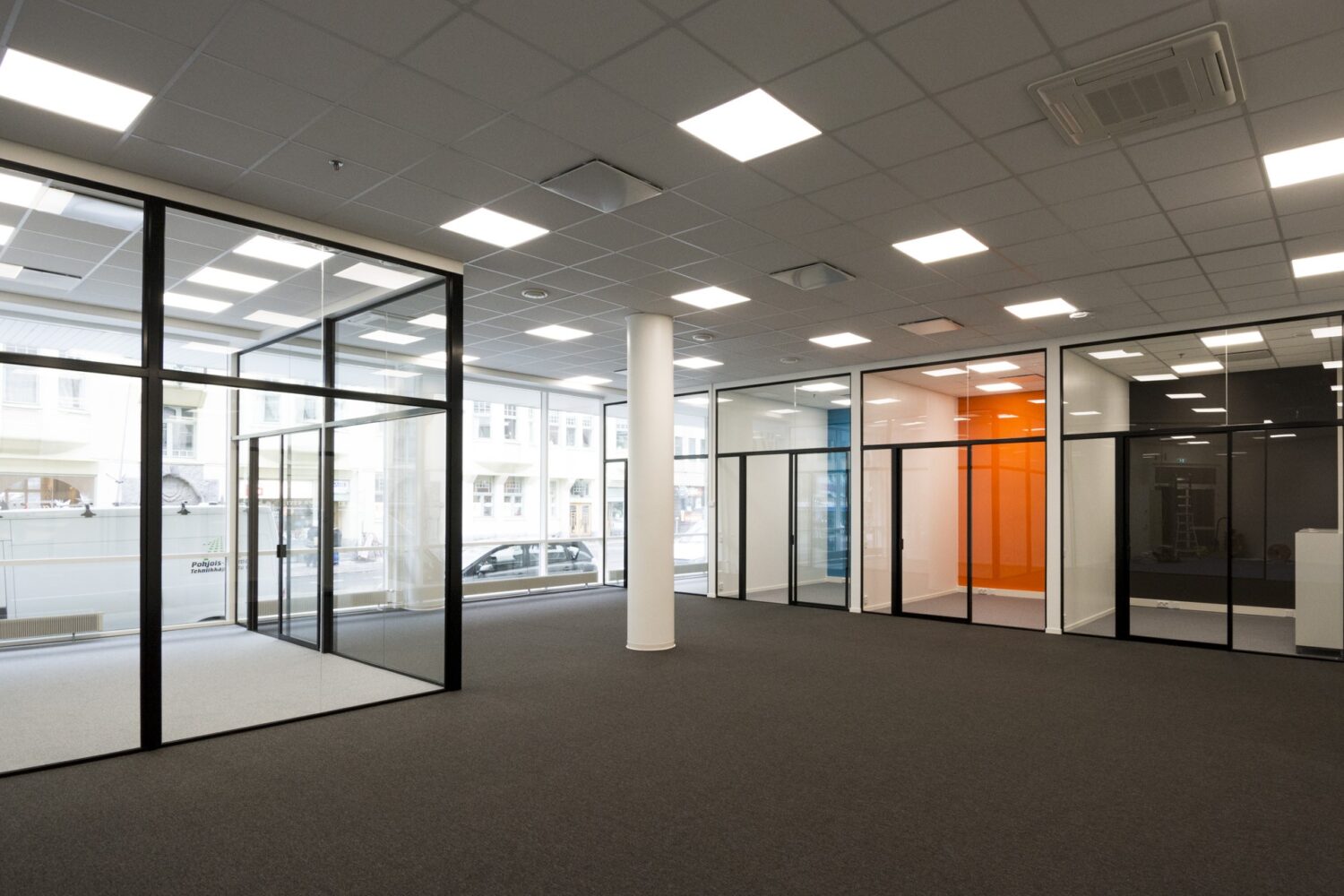 Erittäin siisti tilakokonaisuus jossa avotilan lisäksi neuvotteluhuone sekä 4 työhuonetta sekä keittiötilat. Wc-tiloja 3 kappaletta.