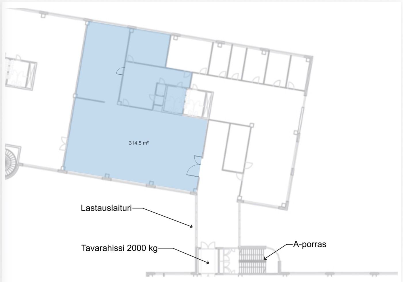 Kiinteistössä on katettu ja tilava lastauslaituri, josta on suora yhteys toisen kerroksen tilaan tavarahissillä. Tämä takaa sujuvat tavaravirrat ja helpon logistiikan. Tavarahissin kantavuus on 2 000 kg (L 2000 x K 2100 x P 3200), ja tilojen lattian kantavuus on 1 000 kg/m2 (q = 10 kN/m2).
